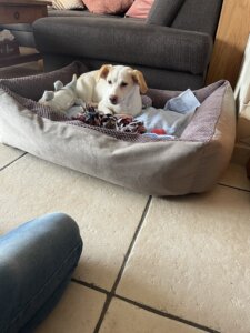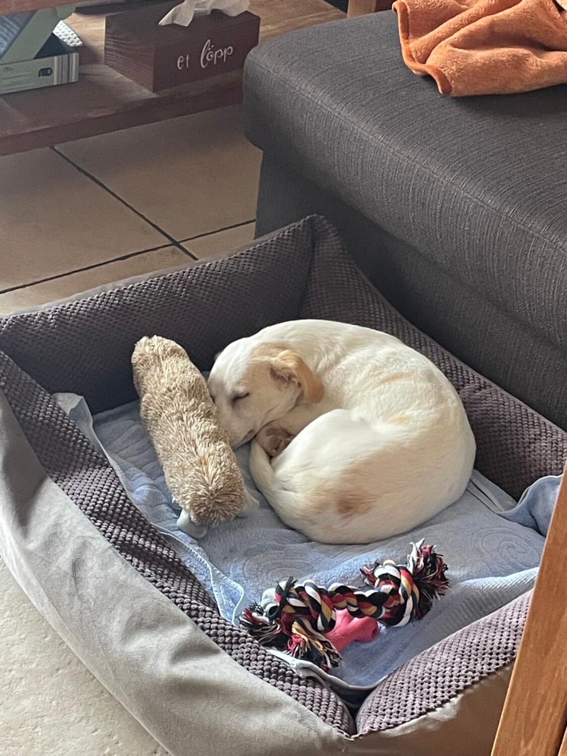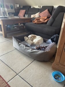 Nachts schläft sie sehr gut in ihrem Körbchen. Sobald sie raus muss wird sie unruhig und es eine Herausforderung zu erkennen, warum sie unruhig wird. Aber auch das kriegen wir mit der Zeit hin.