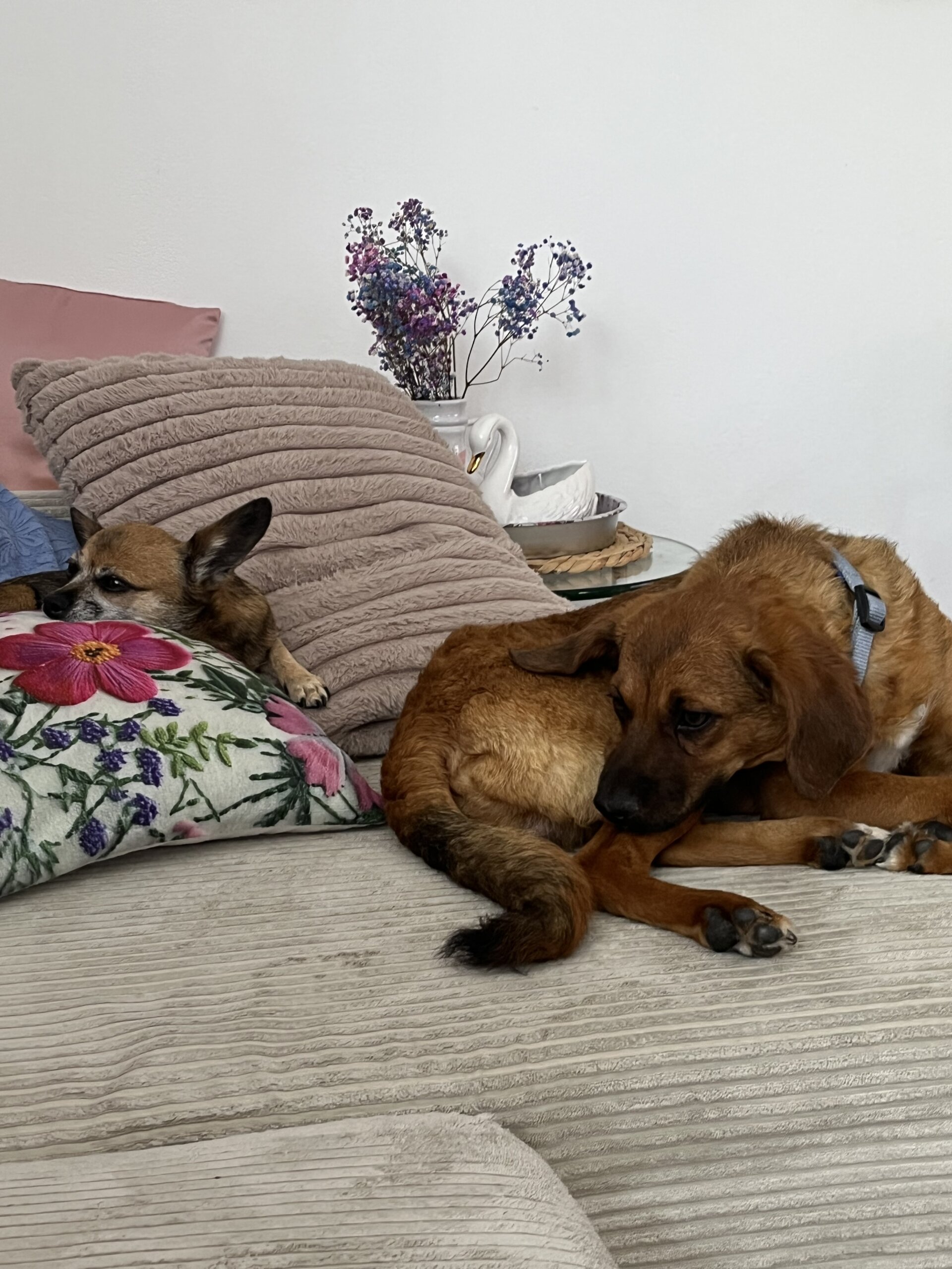 > Meine Lieblingsbeschäftigung ist schlafen, kuscheln, spielen und Schleckies essen. Die gemeinsamen Gassirunden genieße ich immer sehr. Meine neue Schwester Emmi ist noch nicht ganz so überzeugt von mir, aber ich versuche, durch meine charmante Art, sie weiterhin zu überzeugen.😹 Zu mindestens kann ich mich immer so schön an ihr orientieren und sie hilft mir immer, dass ich mich noch sicherer fühle.