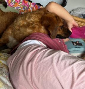 > Direkt habe ich gemerkt, dass ich in einer sehr lieben Familie aufgenommen wurde. Man merkte sofort, dass ich schnell aufgetaut bin. Schon an Tag zwei habe ich mich getraut aufs Sofa zu springen. Schon am Tag drei, nachdem ich ganz viele Schleckies auf der Treppe gegessen habe, habe ich sogar keine Angst mehr vor der Treppe gehabt. Jetzt laufe ich selbstständig die Treppe hoch und runter manchmal so schnell, dass ich manchmal 2,3 Stufen auf einmal nehme.🤣🤣