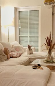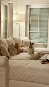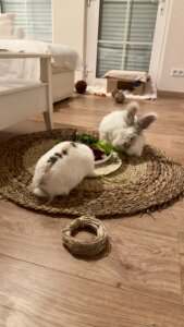 Seit er endlich durch die ganze Wohnung hoppeln darf, geht es ihm wunderbar! Er erkundet alles mit großer Neugier, macht seine kleinen Freudensprünge und hat schon seine Lieblingsplätze gefunden – besonders liebt er es, gemütlich auf dem Sofa zu liegen und alles um sich herum zu beobachten oder mit seiner Freundin Fiene zu spielen.