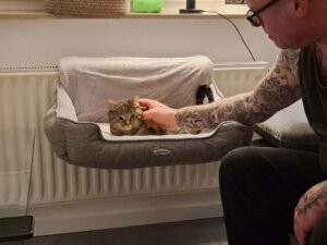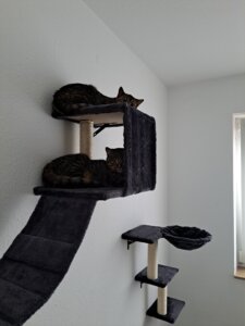 Hier gibt es auch so einen coolen Schlauch, wo ich rein rennen und albern sein kann. Mit der kleinen Mietze (Amalia jetzt Lucy) macht das riesen Spaß! Wir springen da drauf, rennen rein und raus und haben mega viel Spaß mit dem Ding. Und wenn ich keine Lust mehr habe zu spielen (kommt echt selten vor), geh ich einfach auf meine Tron ganz oben. Oder aber ich lege mich auch gerne mal in dieses Heizungshängeding. Voll gemütlich.
