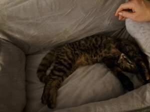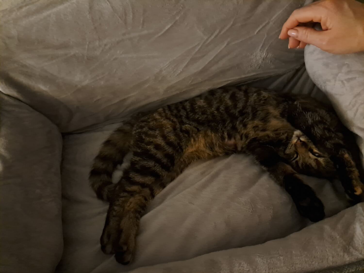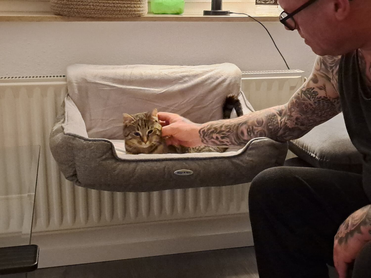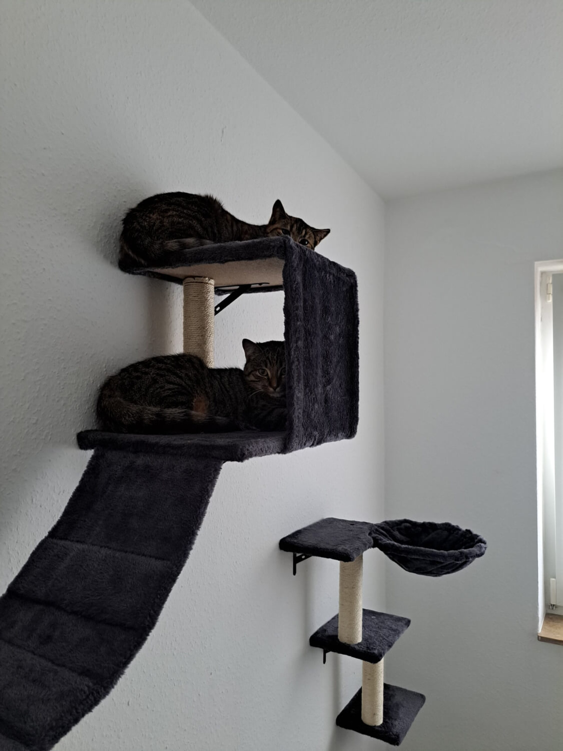 Und ich (kleine Mietz): angekommen, Tür von der Box auf: juhuuuuu, was kostet die Welt!!!! Alles neu und super interessant! Und wow, da an der Wand sind so Dinger, da kann man ja draufspringen, rumkratzen und sogar drin schlafen! Meine Box war mir dann zuwider. Ich habe beschlossen, das ist hier alles meins und bleibe hier! Fühle mich wie Gott in Frankreich und sau wohl. Es gibt hier sogar immer besonders leckere Dinge, wenn man was gut gemacht hat. Da stellt zbsp der 2Beiner die Box mut so nem richtig kuscheligen Zeug drin, ins Wohnzimmer. Und bin super stolz, dass ich da rein gehe, die Tür zu gemacht werden kann, ja sogar die Box hochgehoben wird und ich super entspannt bin, weil es dann wieder diese sau leckeren Sachen gibt. Ja, die Große und ich sind echt voll die Leckermäuler und mögen gerne was fressen. Die Große war so clever, als die mit mir das Boxentraining angefangen haben, sich vorab schonmal in die Bix zu legen, ohne dass der 2Beiner was gesagt hat, weil die gesehen hat, dass es dann was Leckeres gibt. Gar nicht doof die Große. Da kann ich mir so einiges abgucken. Die hat voll schnell raus, was zu tun ist. Mir manchmal etwas zu schlau, weil die dann schneller mit den Leckerlis ist. Aber auch uch habe mit der Großen mega viel Spaß beim Spielen und dieses Schlauchdings ist der absolute Knaller!
